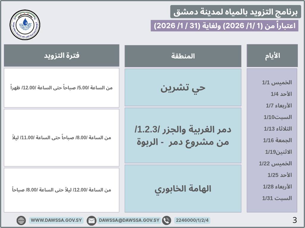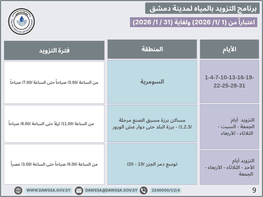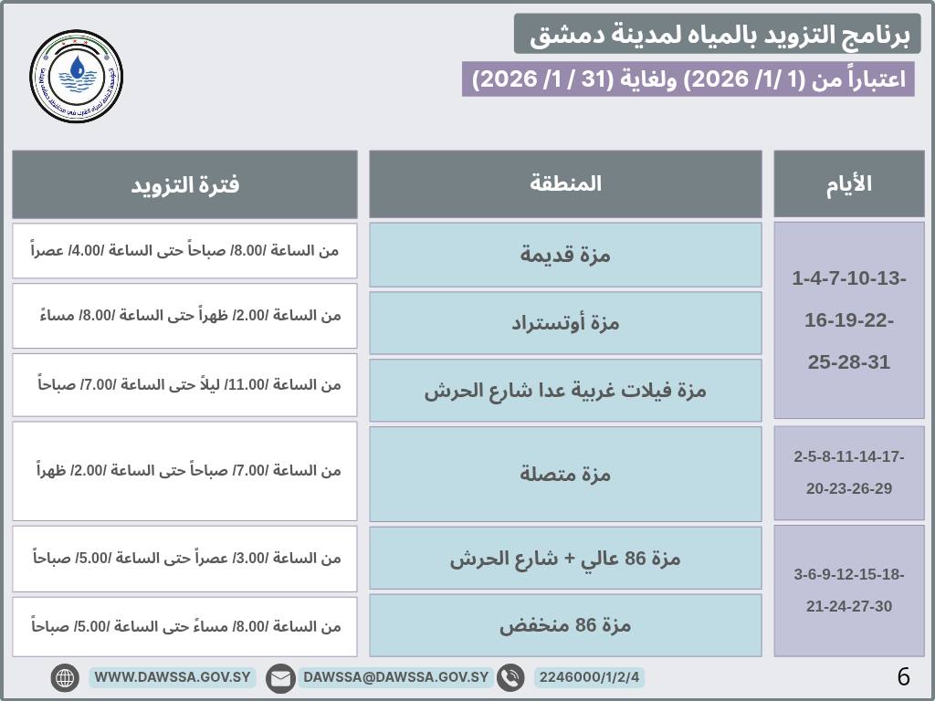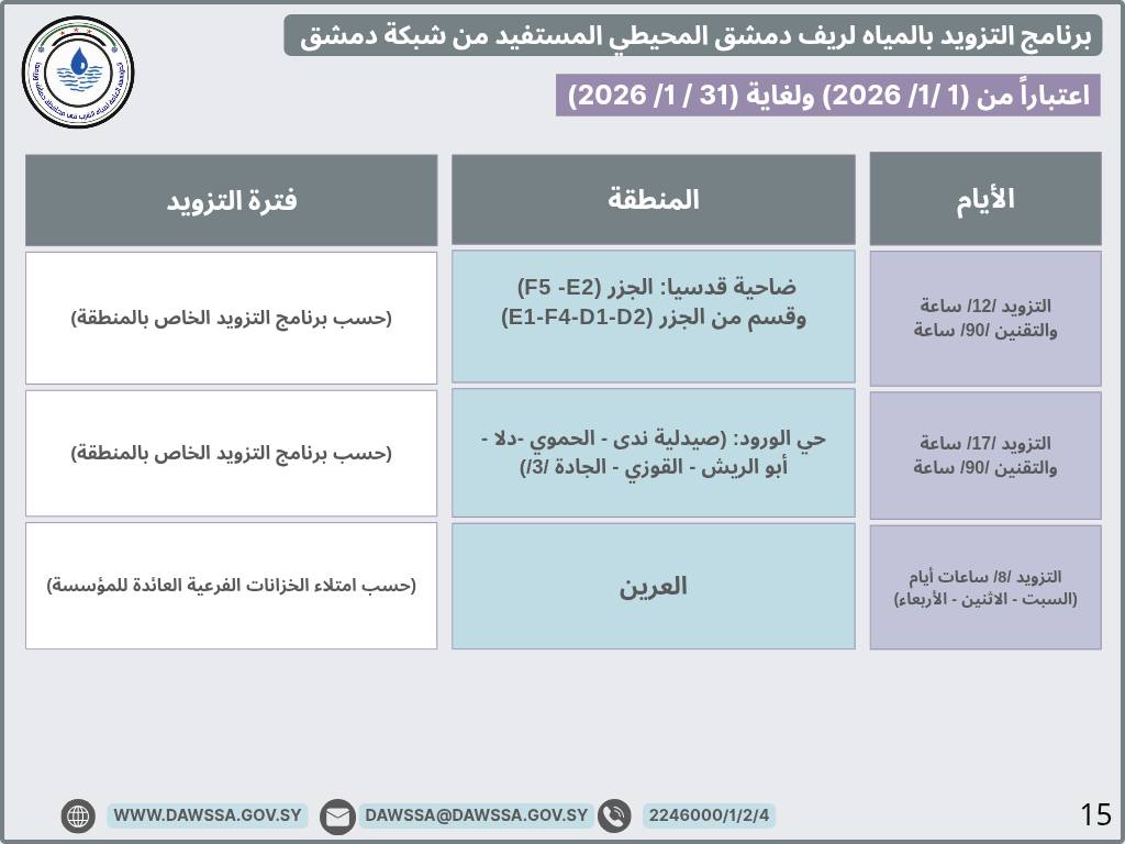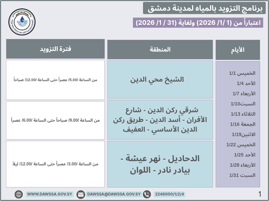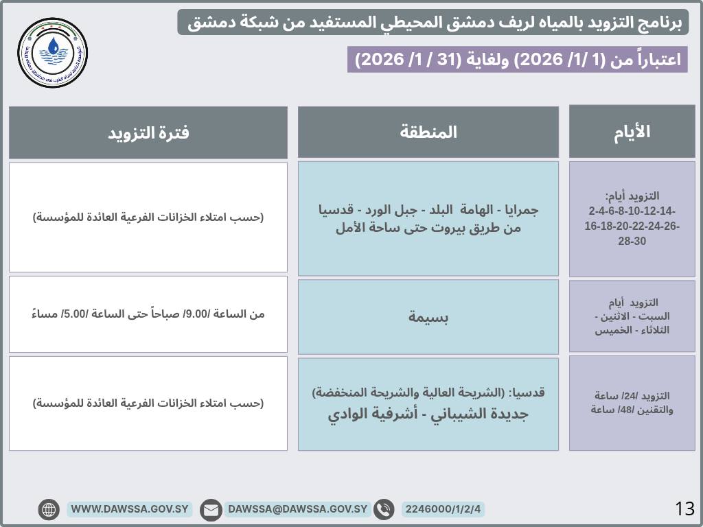 برنامج التزويد بالمياه لمدينة دمشق وجزء من ريفها المحيطي خلال شهر كانون الثاني 2026