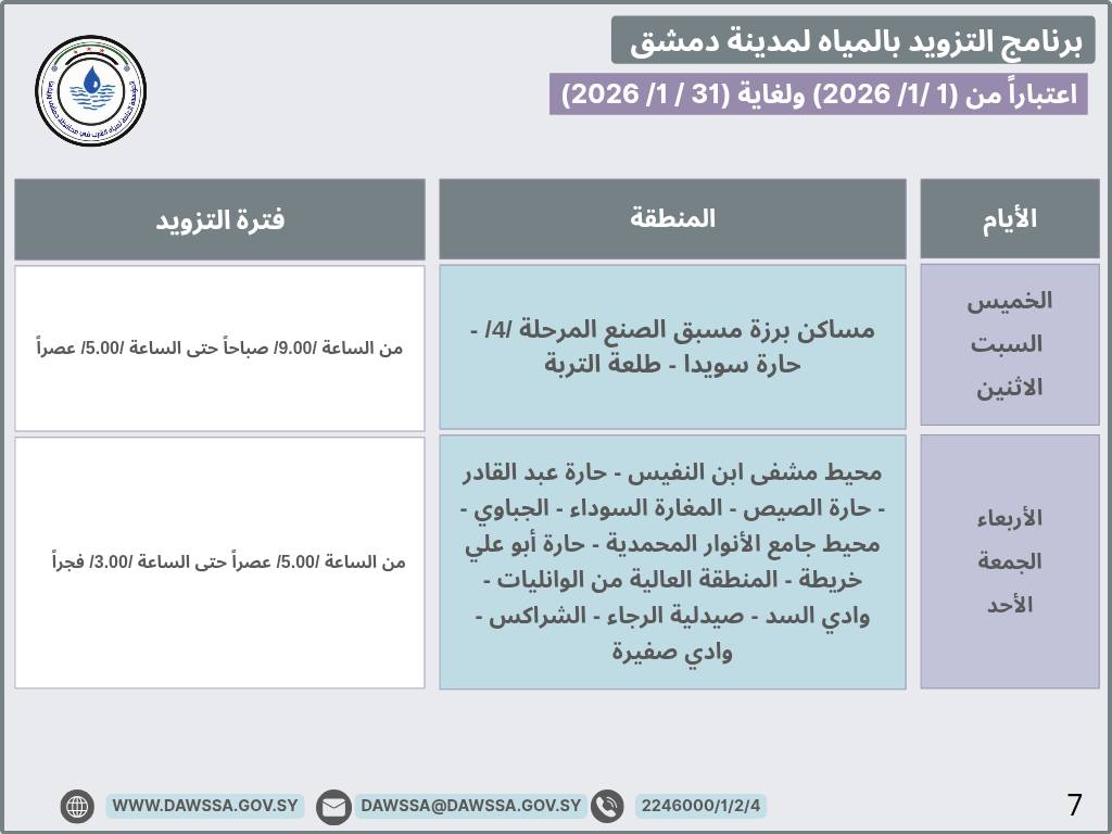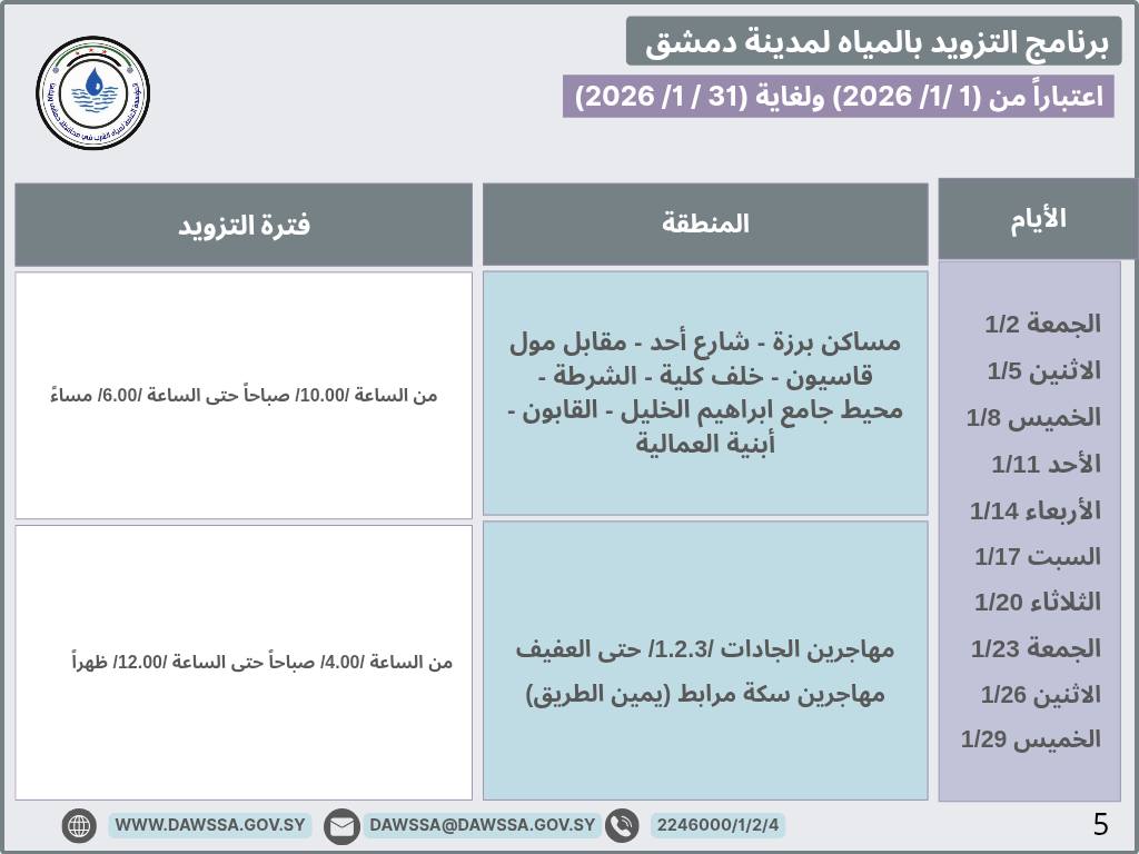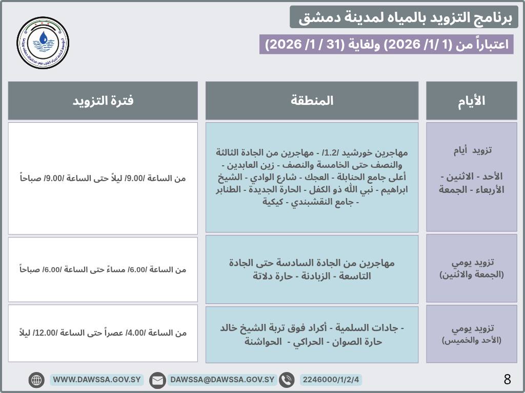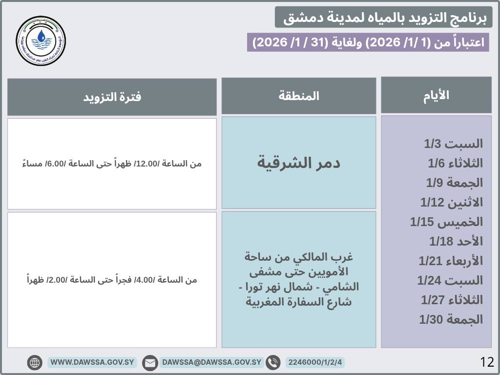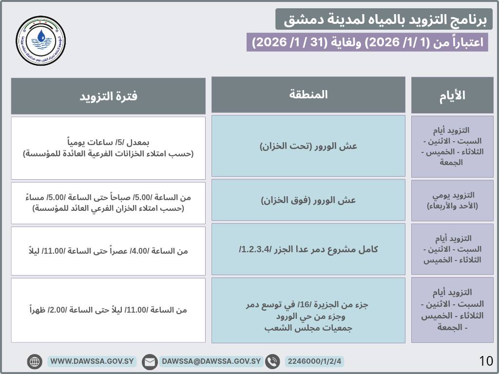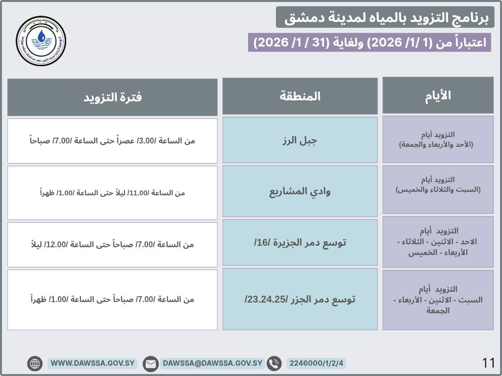 برنامج التزويد بالمياه لمدينة دمشق وجزء من ريفها المحيطي خلال شهر كانون الثاني 2026
