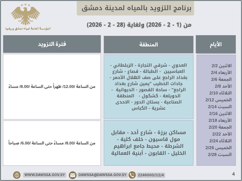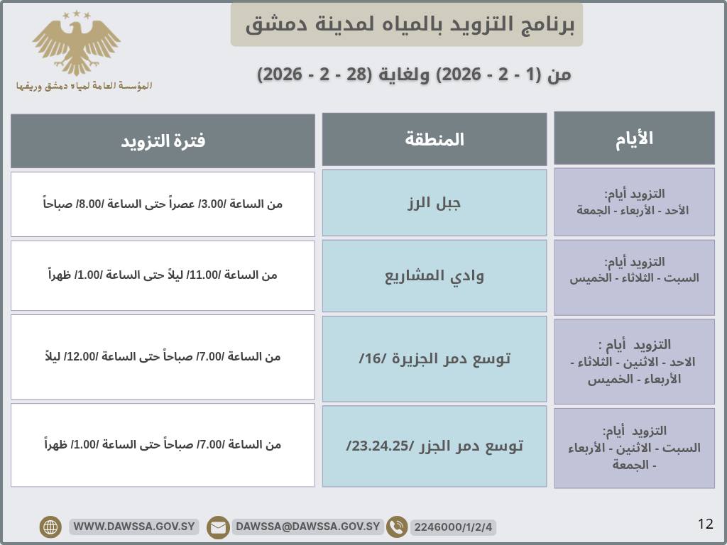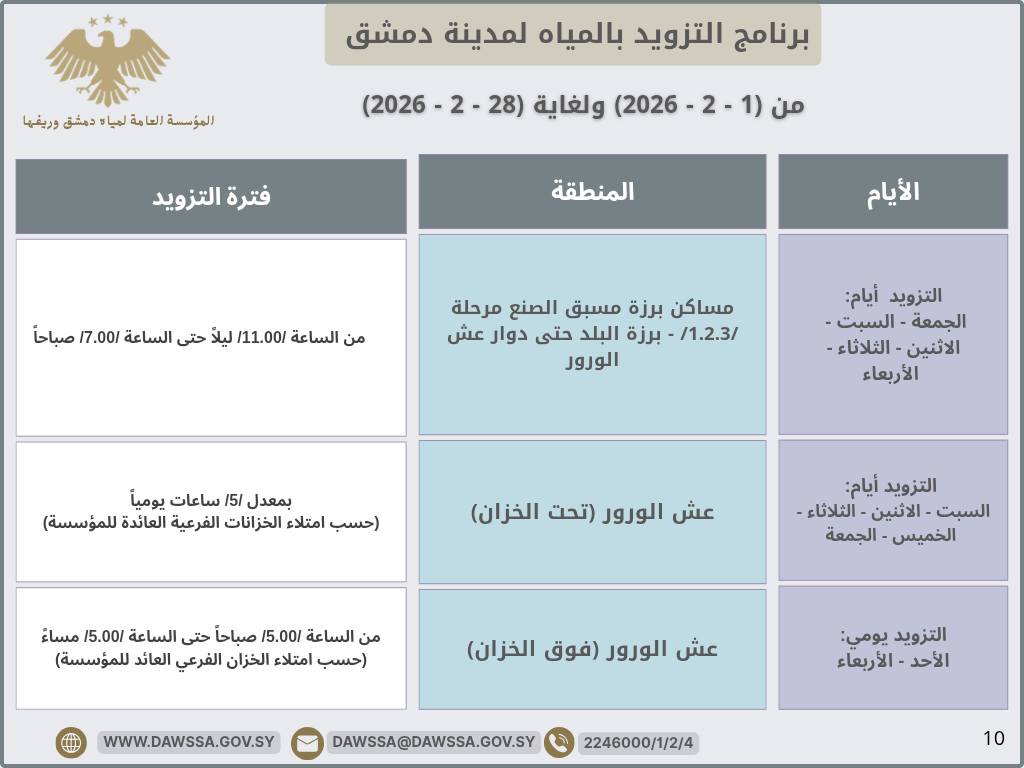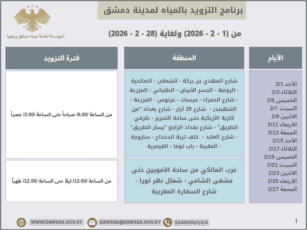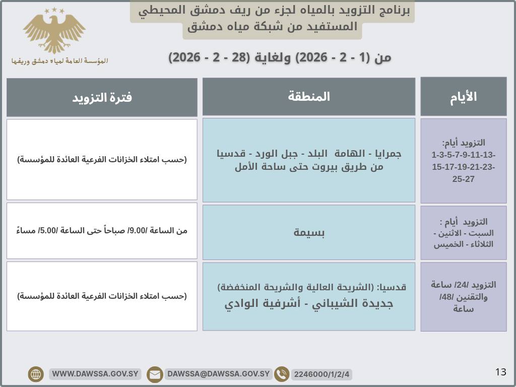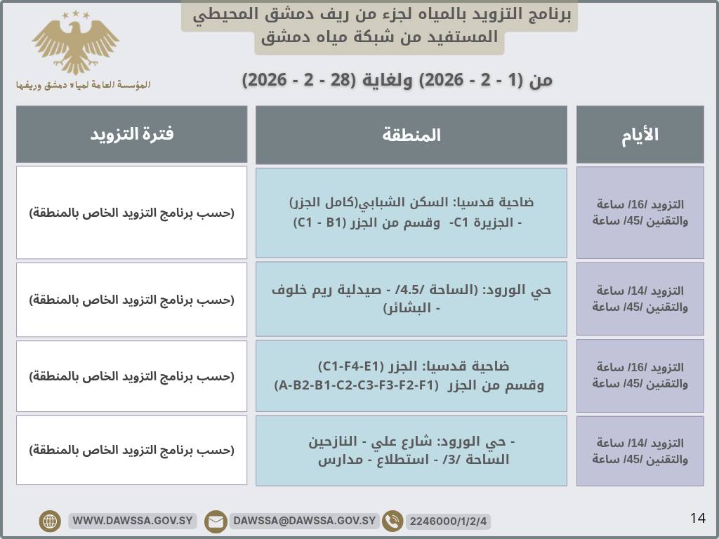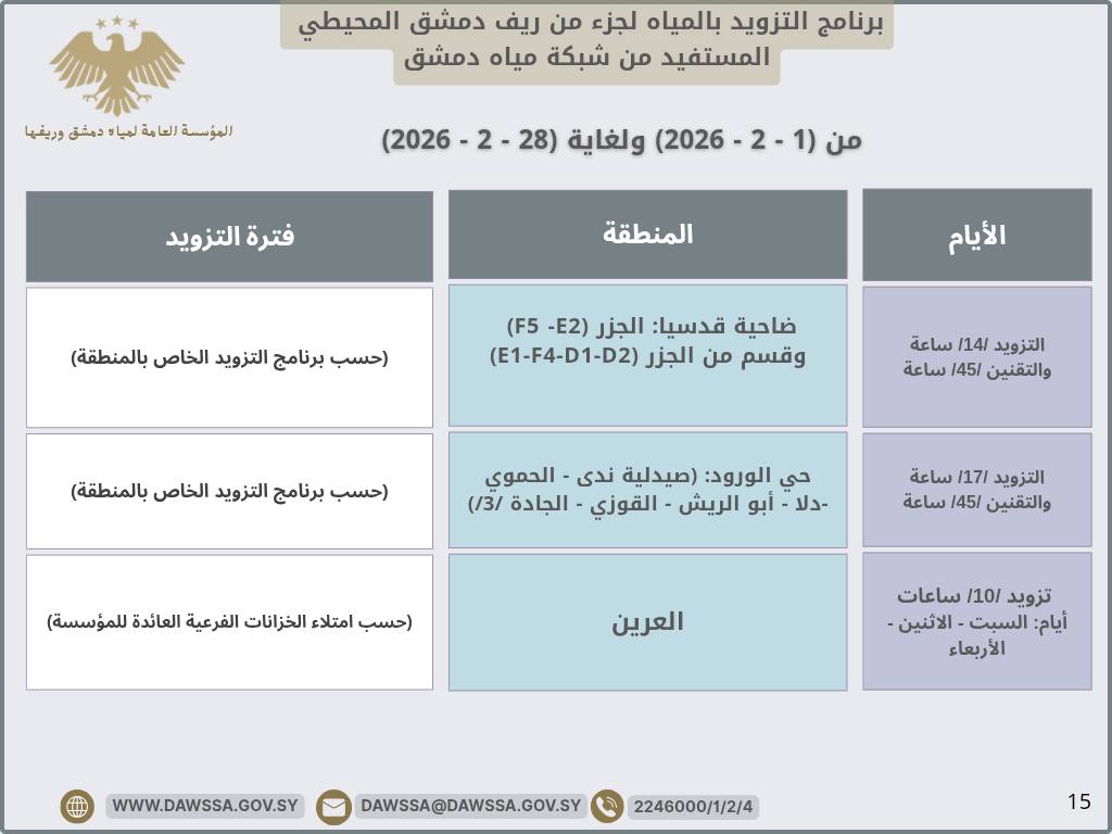 برنامج التزويد بالمياه لمدينة دمشق وجزء من ريفها المحيطي خلال شهر شباط 2026