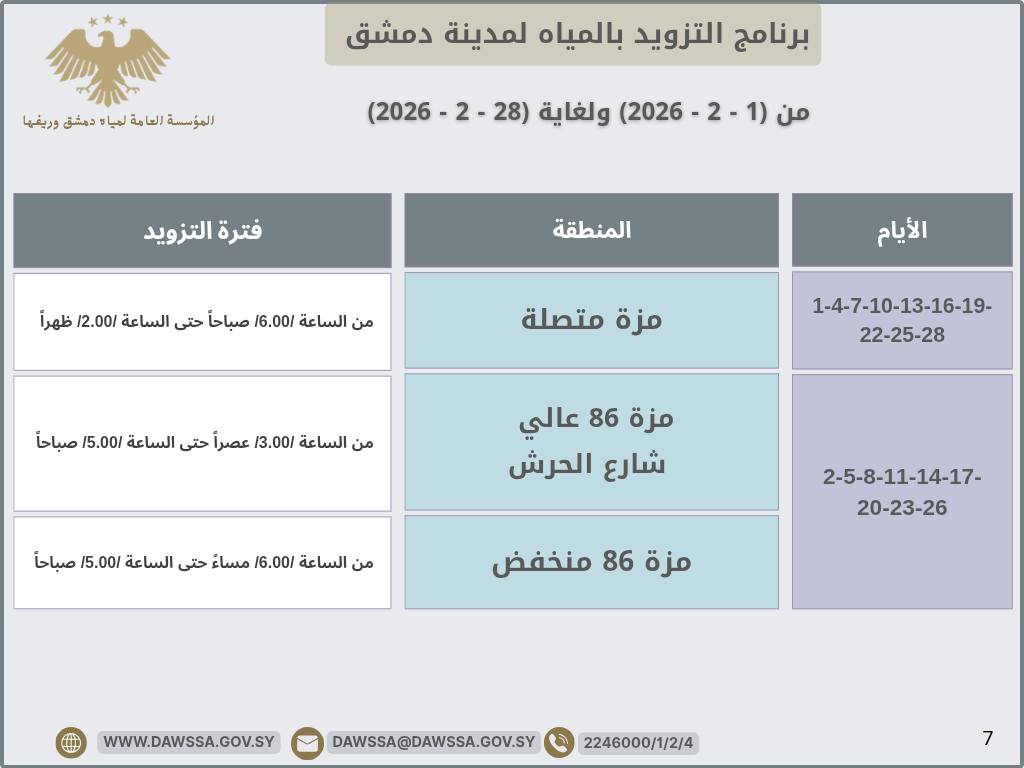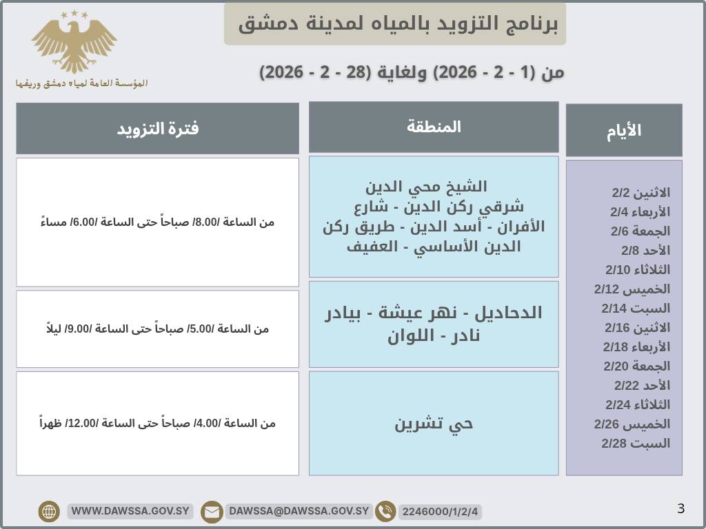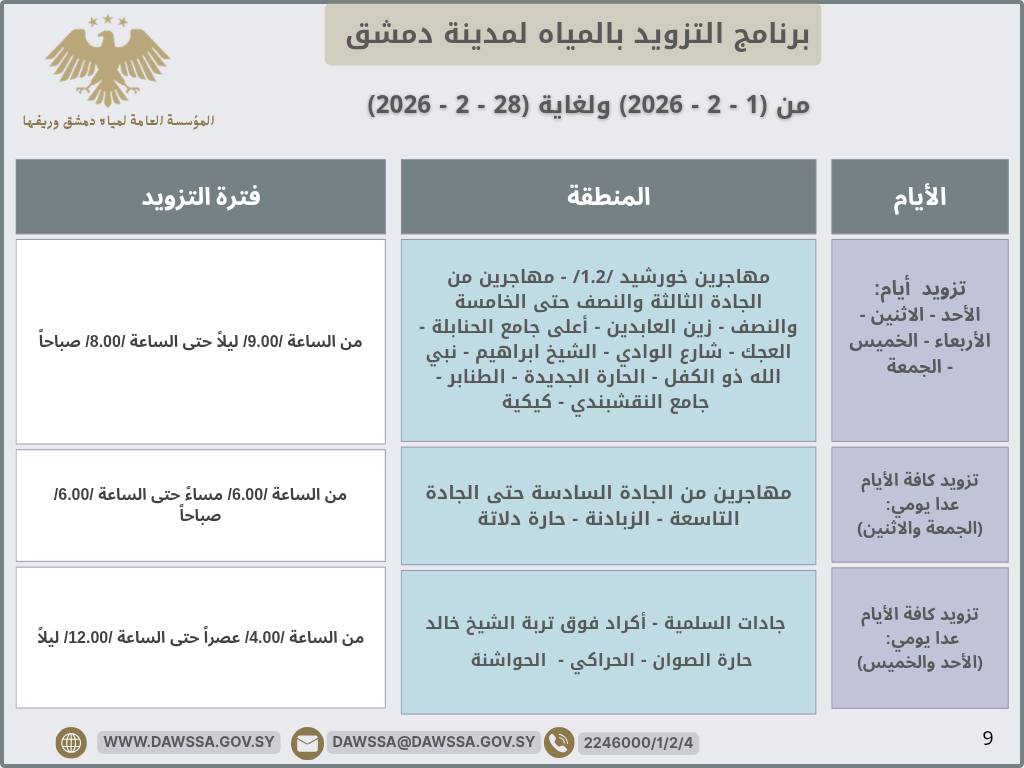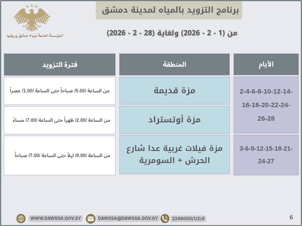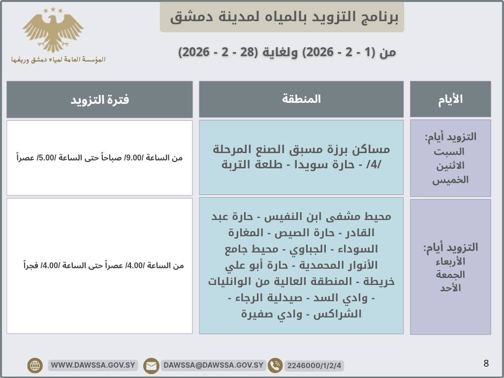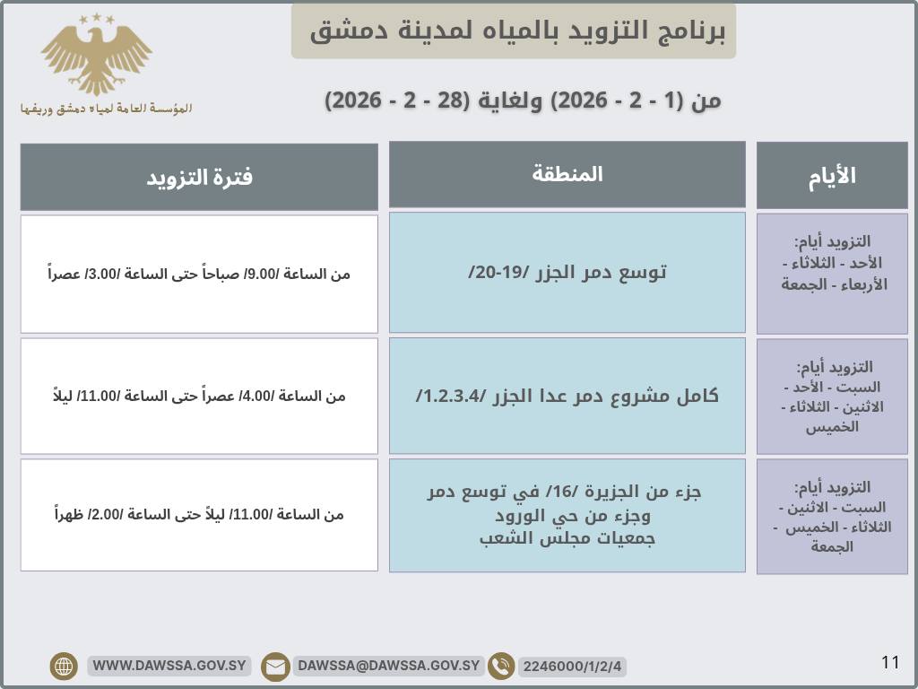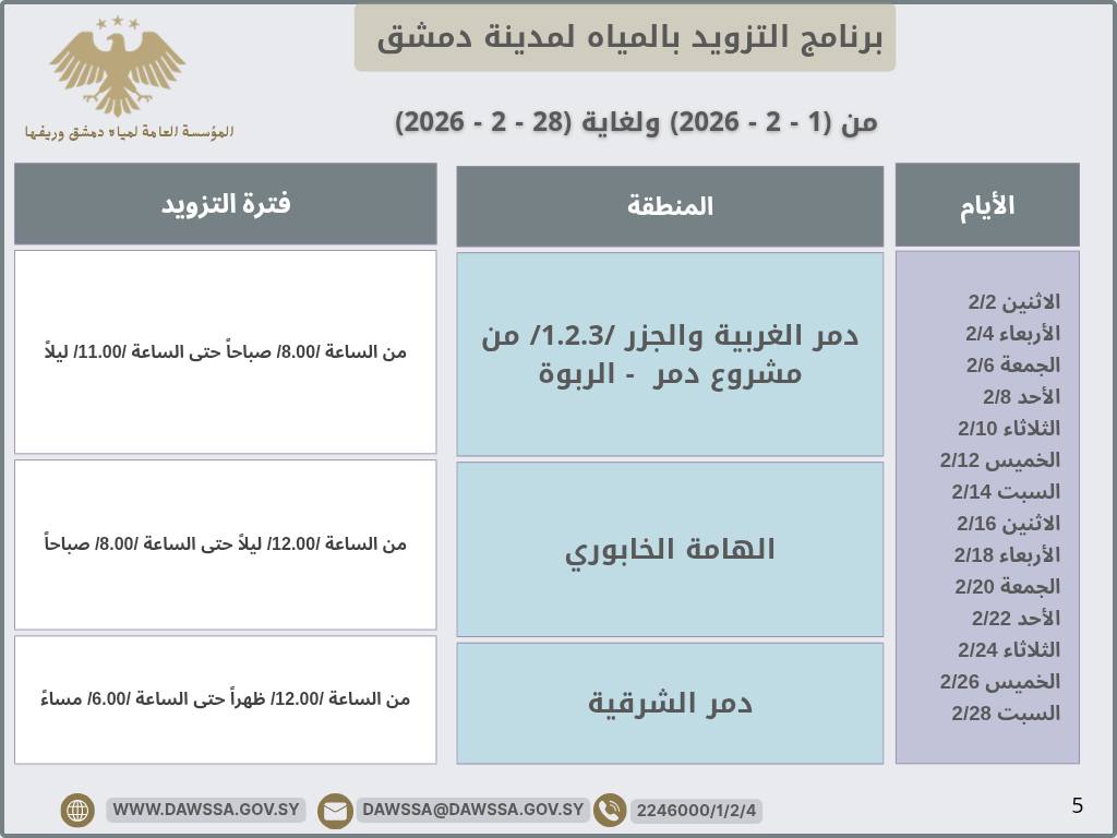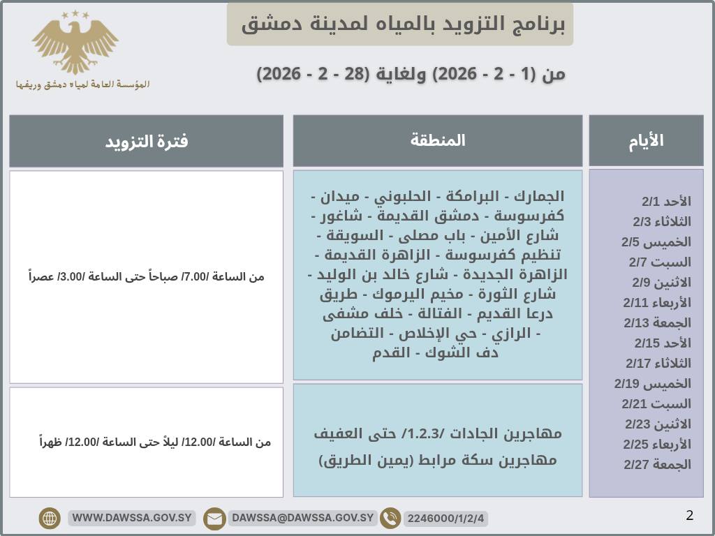 برنامج التزويد بالمياه لمدينة دمشق وجزء من ريفها المحيطي خلال شهر شباط 2026